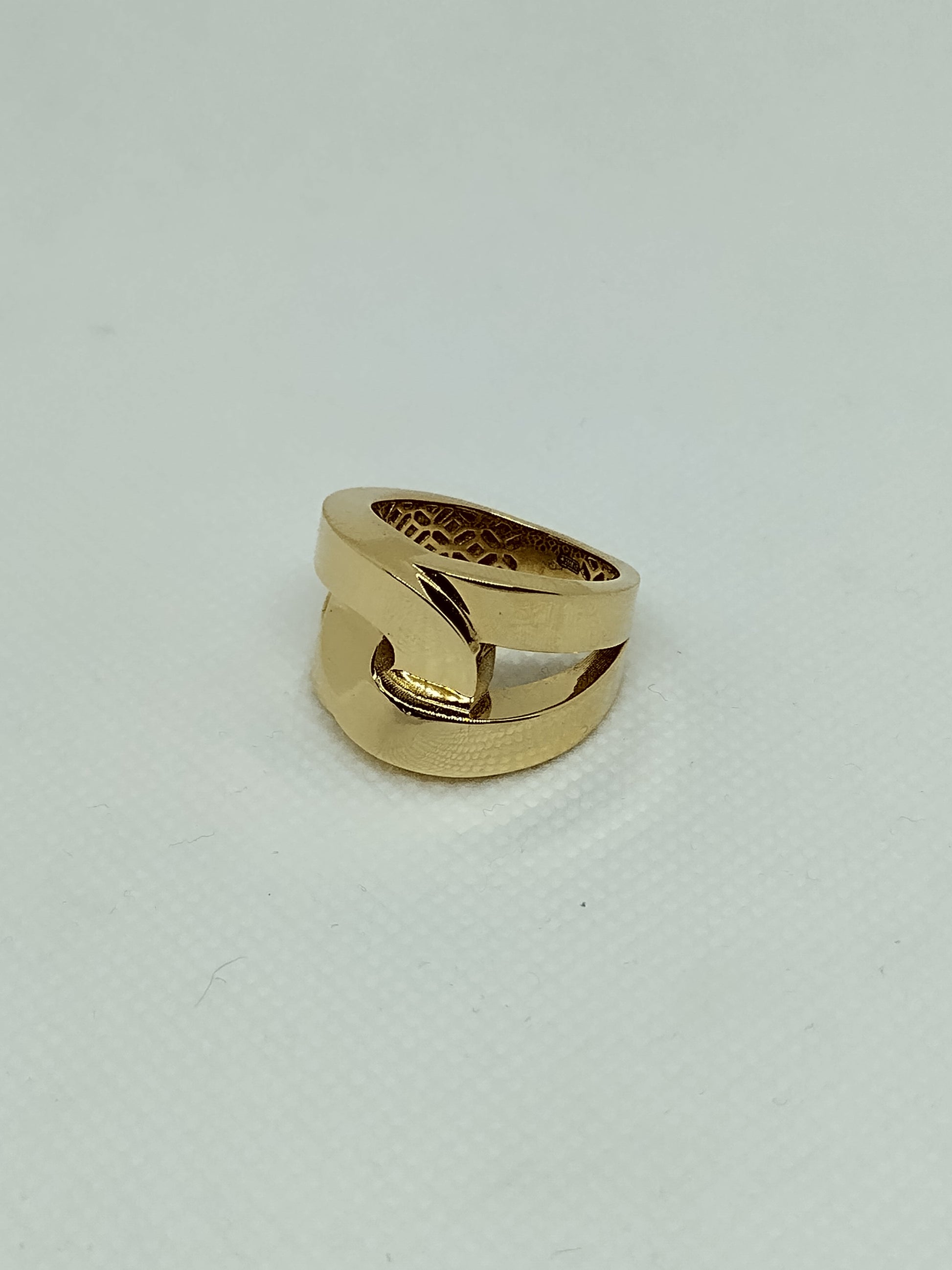 Anello in oro giallo 750 18kt, misura 14, altezza massina cm 1,5, altezza minima 0,5, artigianale.